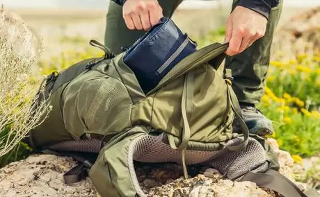 - Pokrivalo za dež v posebnem žepu z zadrgo na spodnjem delu pokrova nahrbtnika. Žep ima tudi trak za pritrditev ključev.