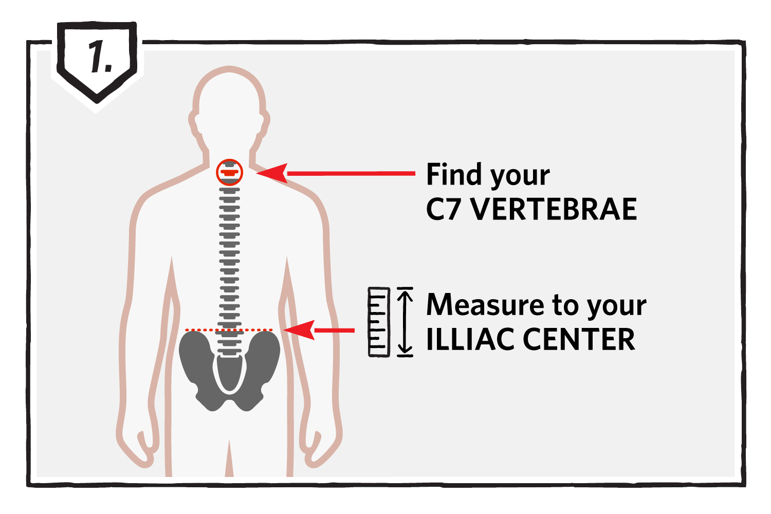Z merilnim trakom izmerite dolžino od C7 vratne vretence – to je najvišja štrleča kost, ki jo tipate pod kožo na vratu, kjer se začne hrbtenica – do medenice (glej sliko)